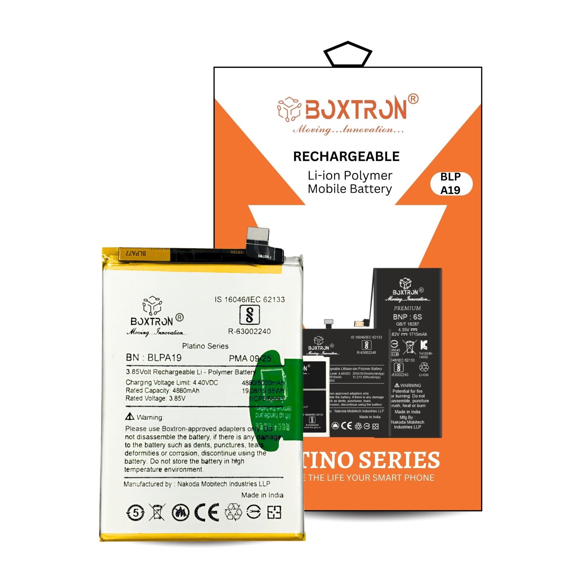 Boxtron Battery Compatible for BLPA19, Oppo A38 and Oppo A58 phones, providing a 5000mAh capacity with a Lithium-ion type. BIS Approved 180 Days Replacement Warranty.