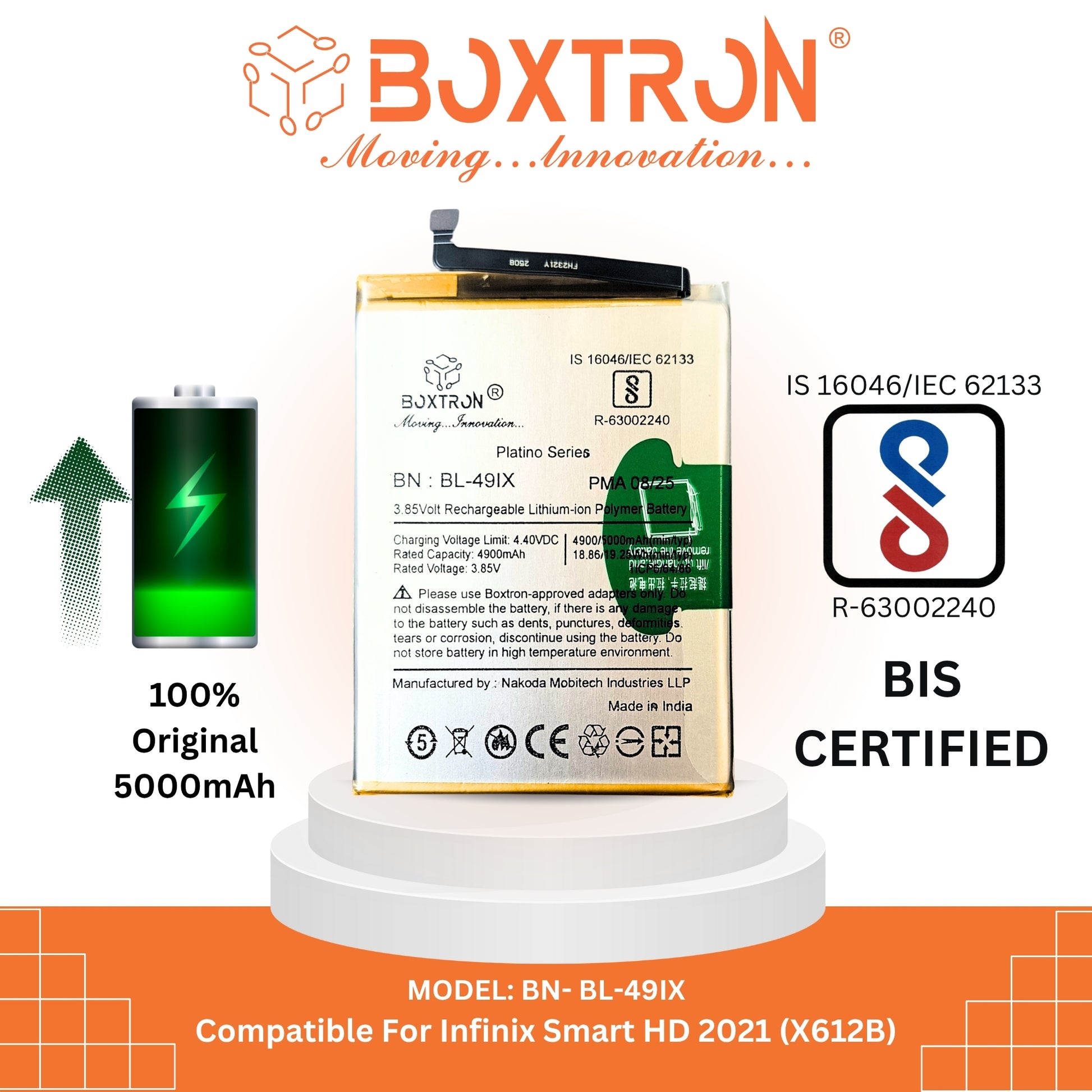 The Boxtron BL-49IX is a high-performance 5000mAh lithium-polymer replacement battery designed specifically for Infinix Smart HD (X612B / X612). BIS certified and manufactured with premium-grade cells, this battery ensures long-lasting backup, stable performance, and safe charging. Backed by a 6-month replacement warranty, it is the ideal choice for restoring your smartphone’s battery life.