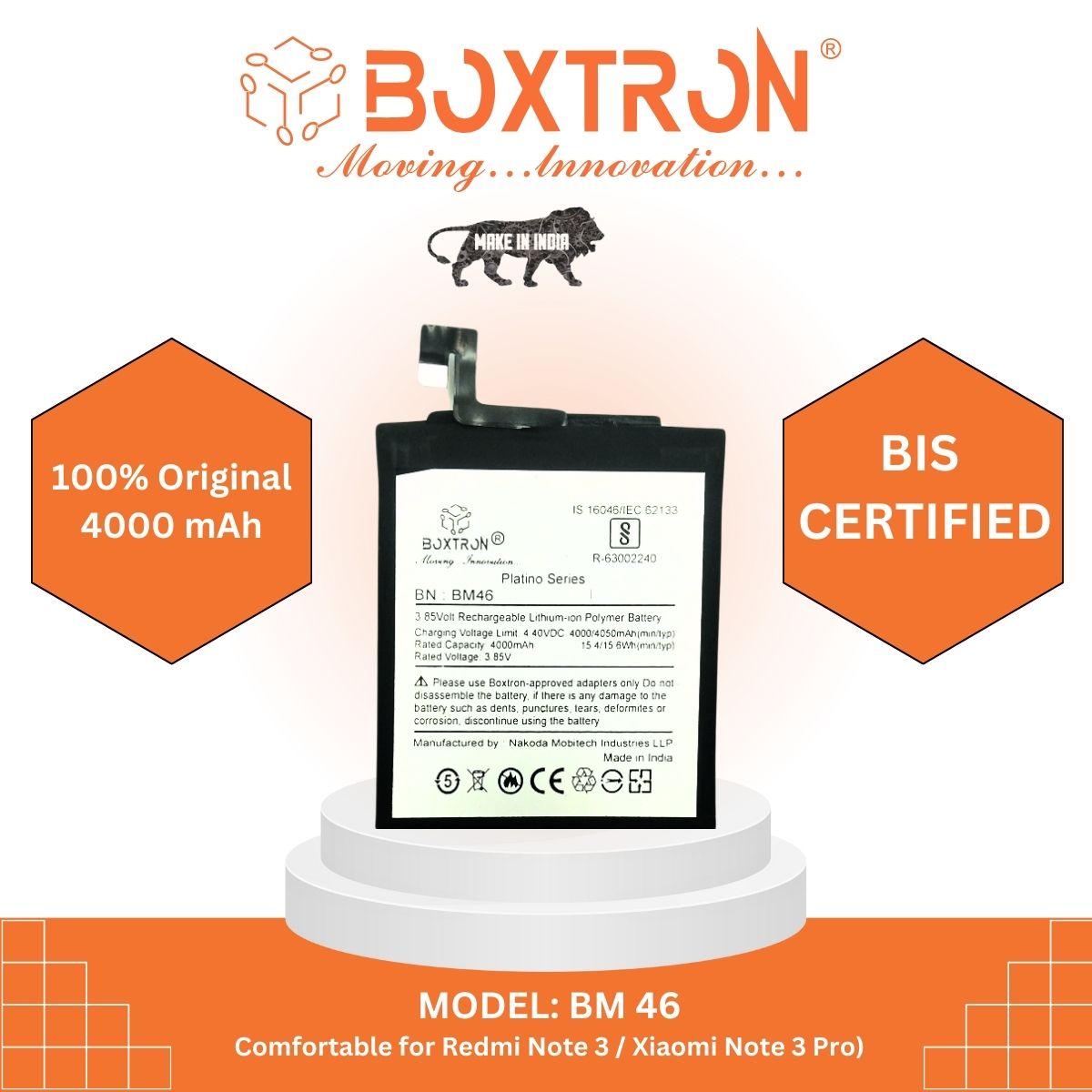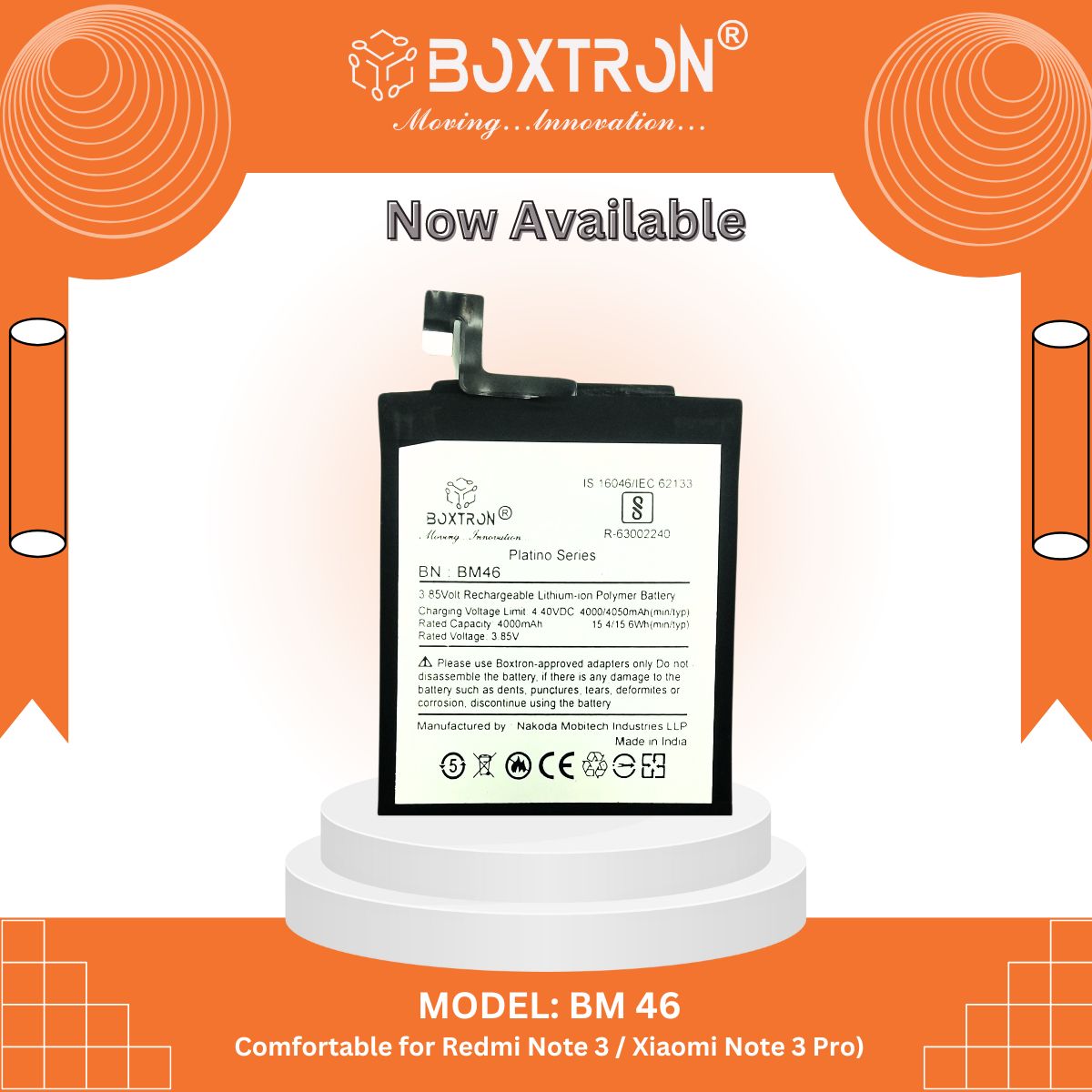 Boxtron BM 46 Battery Compatible Redmi Mi Note 3 Pro/Note 3X / Note 3 -4000mAh Battery Capacity .