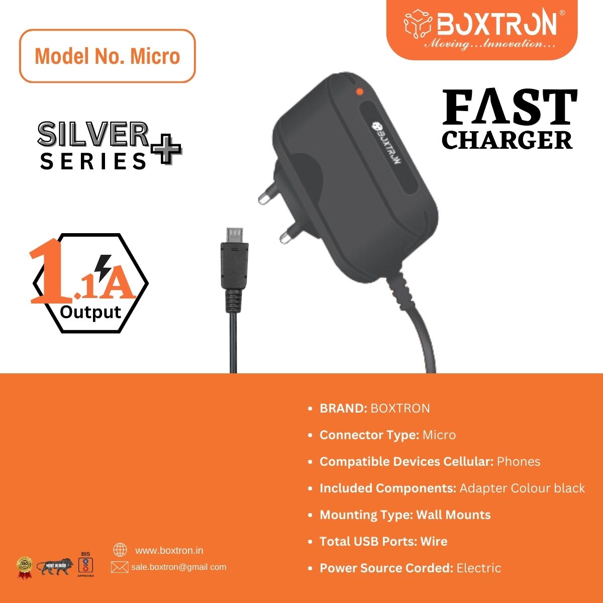 Boxtron BX-V8 Micro-Mobile Charger Compatible Charger For Mobile Phones Micro Pin Charger, Black
