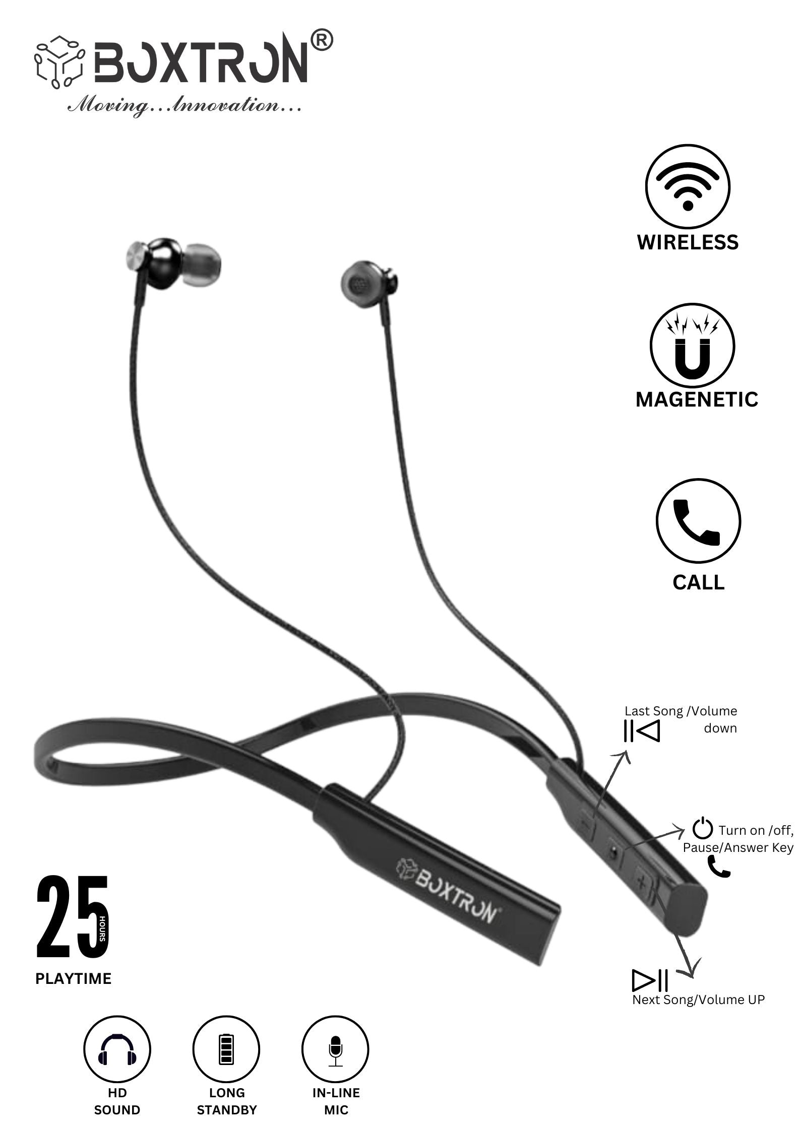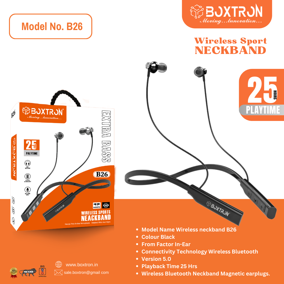 Boxtron B26 Wireless Bluetooth Neckband 5.0 25 Hours Playtime, Magnetic Eartips, Extra Bass Neckband,Long stand By Battery,